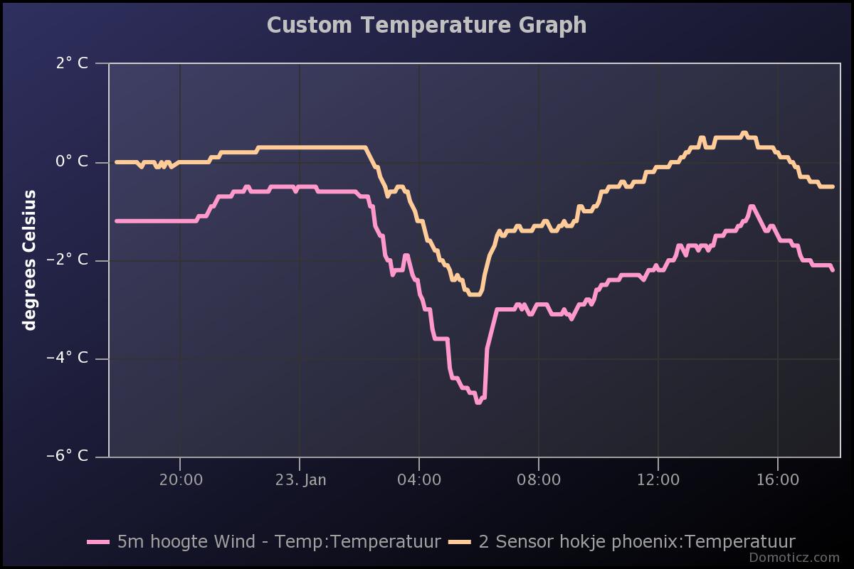 Onderstaande grafiek geeft de temperatuur van deze nacht en vandaag weer.