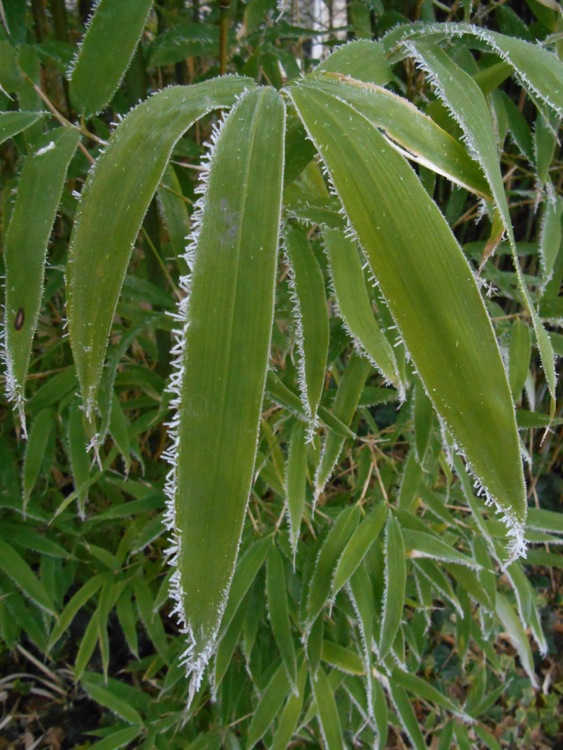 Na een nacht met mist en matig vorst ziet de wereld er anders uit. Trachycarpus wagnerianus heeft zich tegen verdamping beschermd door samentrekking van de waaiers.