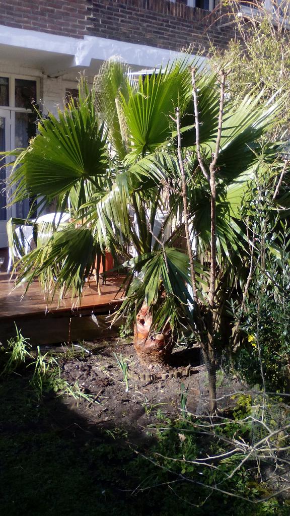 Een plaatje van 1 van m'n Washingtonia's, staat in de tuin in Den Haag sinds mei 2008. De eerste winter niets gedaan aan bescherming, daarna een lichtslang en afdak. Dat werkt prima, ook na feb 2012 geen schade door de vorst. Wel altijd veel windschade, bladeren worden door de wind behoorlijk gescheurd soms.