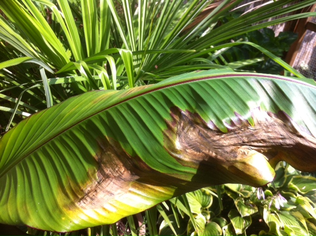 De laatste 2 bladeren van mijn Ensete krijgen bruine vlekken. Het blad is op die plekken echt dood.