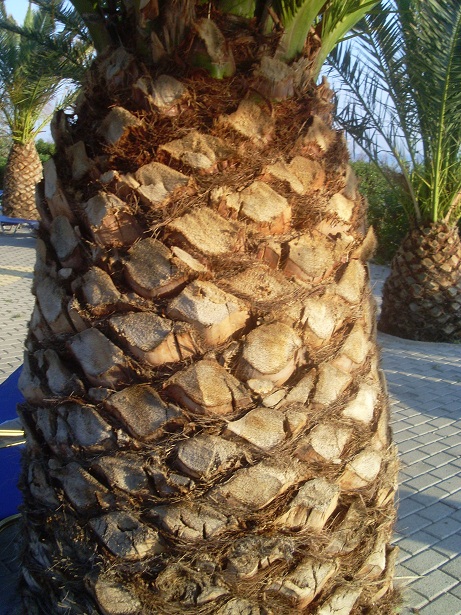 Phoenix canariensis en Chamaerops humilis met (vrouwelijke) bloeiwijze en zaad. De zware stam is kenmerkend voor de canariensis. Phoenix theophrastii vormt net als de Chamaerops clusters.