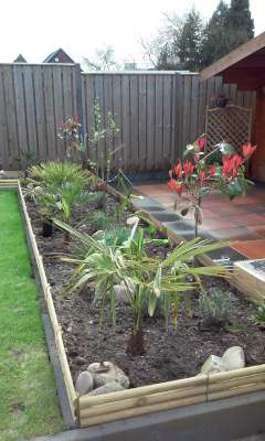 En dan kom je erachter dat je wat plantjes over hebt.... :? wat doe je dan...je verwijderd nog wat tegels vliegt naar de bouwmarkt voor een leuke border en plaatst die vervolgens. :D waarbij je er vervolgens achterkomt dat er veel klei in de grond zit op die plek.. :cry: maar eind goed al goed.. :thumb_up: