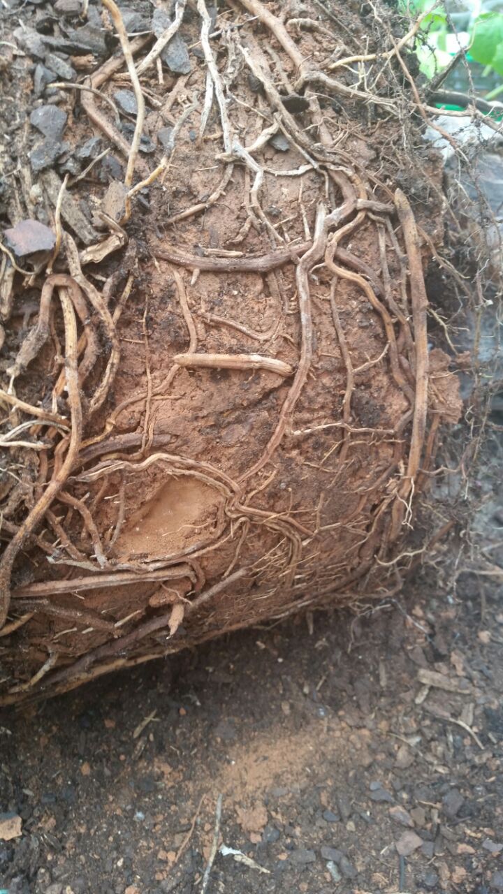 Rode klei en stenen, het gewicht van de Brahea moet aanzienlijk zijn geweest, de verrassing was dus enigszins voorspelbaar ;) Ik heb ervaring met Chamaerops waarbij het grotendeels verwijderen van deze klei nooit tot problemen leidde. Overigens haal ik alleen aan de periferie zoveel mogelijk losse brokken weg en laat het dichtbewortelde deel van de kluit ongemoeid. Een paar jaar geleden deed ik hetzelfde met een grote Brahea armata. Dat leidde tot een groeistop. Vervolgens heb ik de palm een periode in de somstijds bloedhete kas gehouden, waardoor de groei weer op gang kwam. Reken daarom op een terugslag in groei en bid voor een hete zomer.