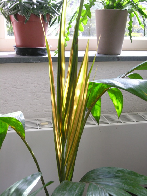 Ik verloor onlangs 2 bladeren van 4, waarvan 1 zoals te verwachten geleidelijk en kort daarna een tweede onverwacht snel, zodat de palm er nu ietwat onttakeld bijstaat. Staat nu buiten in de hoop dat dit de nieuwgroei stimuleert. Deze palm is koudegevoelig en verdraagt geen vorst (zone 10B).