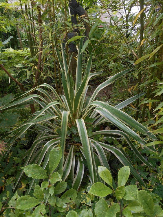 Voor zover ik weet heeft de filamentosa juist tamelijk smal blad. Ik heb althans de 'Bright Edge' een paar maal in de tuin uitgeprobeerd, maar dat werd niets op de klei en de kletsnatte winters met soms flinke vorst. Het resultaat na enkele overleefde winters was niet om over naar huis te schrijven. Bovendien maakten naaktslakken korte metten met de nieuwe scheuten. Hetzelfde overkwam de flaccida 'Golden Sword' nadat deze had gebloeid. Dat deze soorten minder bestand zijn tegen ons klimaat i.e. minder winterhard wordt hierdoor bevestigd. De veronderstelde hybride 'gloriosa' type variëgata overleeft hier wel. Deze staat vrij droog aan de voet van een pol hoge bamboe (Semiarundinaria fastuosa) en krijgt niet veel zon. Dit zou de bloei doen uitstellen en de kans op de ontwikkeling van een stam vergroten. De 'Bright Star' staat ernaast, maar die groeit veel langzamer waarschijnlijk door gebrek aan bladgroen.