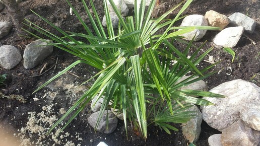 Is de Trachycarpus pas aangeplant, houdt dan rekening met een extra waterbehoefte van de palm zolang deze nog geen nieuwe wortels heeft gevormd. Het afstoten van oud blad is dan een aanpassing. Helemaal te vermijden is het niet, zeker nu het warmer wordt en de verdamping toeneemt. Eventueel kun je de palm wat schaduw geven zodat de bladverdamping wordt beperkt. Trachycarpus hoeft niet per se in de volle zon te staan, integendeel deze palm doet het prima in de schaduw. Zolang hij goed groeit en de vergeling alleen de oudste bladeren betreft, is er geen redenen om je hier zorgen over te maken. Ik zie naast de palm een waterpoel, maar neem aan dat het een folievijver is.