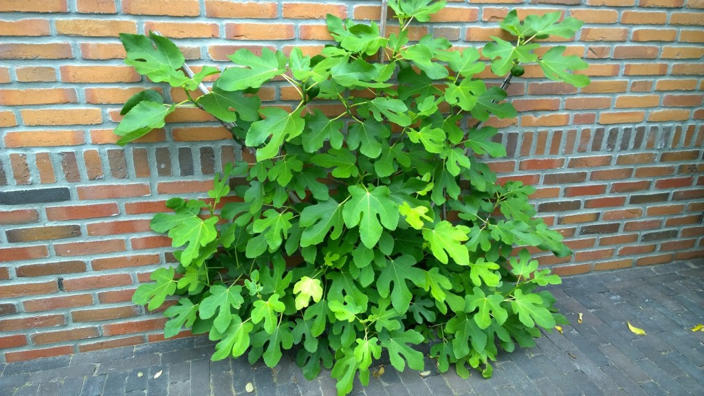 Ficus carica. Deze staat nu twee jaar in de vollegrond. Dit is een stek van een worteluitloper die erg gedrongen groei heeft. De groei is grillig en max 20 cm per jaar. Prima, ik wil m groot hebben hier, maar het grillige vind ik erg mooi. Deze draagt twee keer per jaar vruchten.