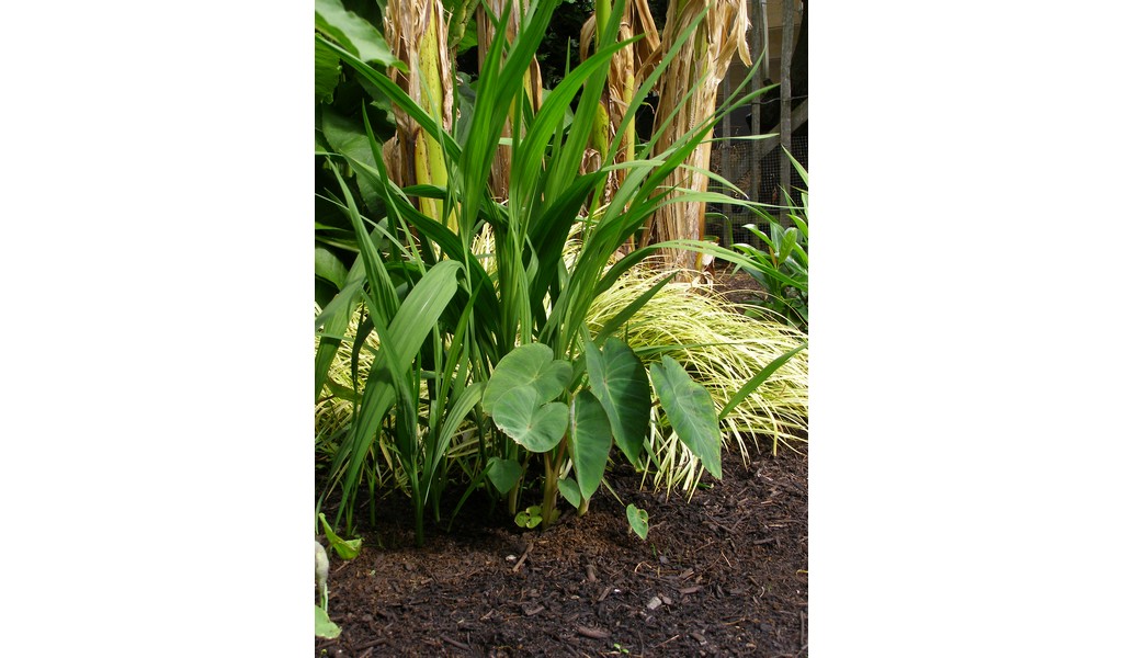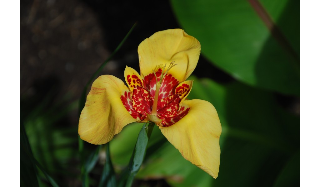 Tigridia pavonia achter de Colocasias
