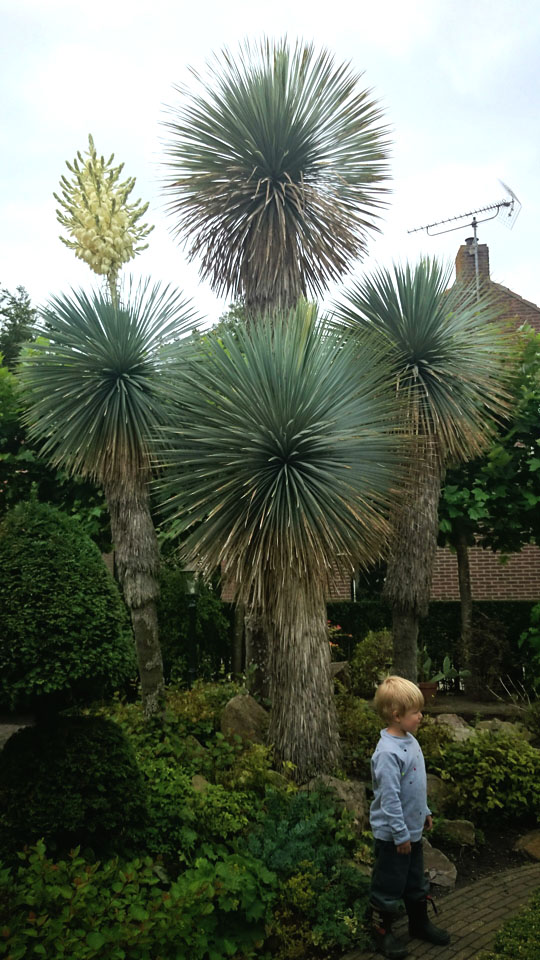 Deze Y. Linearifolia heb ik sinds begin april 2015 in mijn voortuin aangeplant, dit nadat ik hem eerst een jaartje heb laten wortelen. Als je goed kijkt merk je op dat ie aan de ketting ligt. Enkele jaren geleden stal immers iemand een Wagnerianus uit dezelfde voortuin. De kop is nog niet superprachtig maar het gaat de goede kant uit.