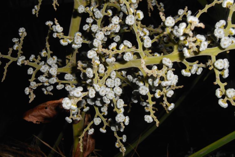 Ik heb een foto gemaakt van de vruchtzetting bij mijn wagnerianus. Het ziet er hetzelfde uit als bij de afgebeelde nanus, alleen heeft de bloeiwijze een opener structuur. Het 'cadetje' is samengesteld uit 3 vruchtbeginsels die samen de bloem vormden. De drietallige opbouw van de bloem is karakteristiek voor de Palmae en veel andere monocotylen zoals bijvoorbeeld de lelieachtigen. Of in deze beide gevallen de vruchtzetting kiemkrachtig zaad zal opleveren waag ik te betwijfelen. Gezien het verhaal is de kans groot dat de zaadontwikkeling niet doorzet en de vruchten voortijdig afvallen. Bij de vorige gelegenheid waarbij ik de vrouwelijke bloemen van de wagnerianus met het verkregen stuifmeel had bewerkt, waren de vruchtbeginsels rond deze tijd veel verder ontwikkeld met de onrijpe zaden reeds prominent aanwezig.