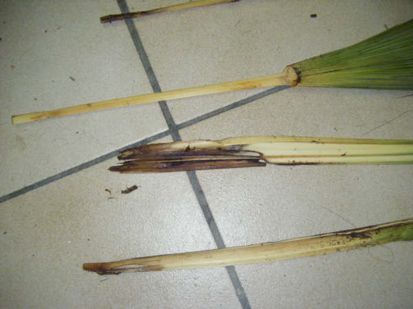 De bladeren die ik uit de speer trok, roken rot aan het gedeelte die uit de stam kwam ook.