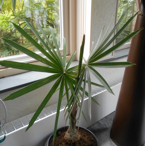 Ik heb deze bijzondere palm met zijn fraaie wielvormige stijve bladeren sinds het voorjaar (overgenomen van Edwin-Airmulp). Het is geen sprinter maar 2 bladeren per seizoen lijken me goed haalbaar. Momenteel is een derde blad bezig zich een plek tussen de 2 bestaande te veroveren. De palm staat hier bij het venster op het Zuidwesten in de woonkamer waar de temperatuur 20 ± 3 °C bedraagt. Vanwege terugkerende problemen met spintinfecties (in de zomer met name) heb ik de gevoelige zachtbladige palmsoorten door resistentere soorten vervangen, zoals deze Coccothrinax alsmede Latania lontaroides, Hyophorde lagenicaulis, Chambeyronia en Ravenea glauca.
