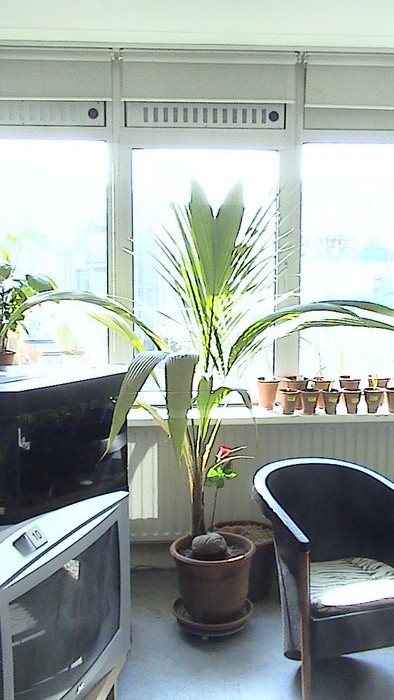 Uiteindelijk rond 2006, zo'n 15 jaar later, was dit plantje nog niet uit mijn hoofd. Ik had wel een echte cocospalm gekocht en die stond voor een grote raampartij van mijn lichte appartementje en deed het verrassend goed.