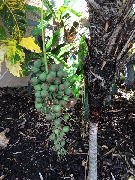 Deze planten deden het goed en zijn nu nog steeds erg mooi, maar toch is dat 't niet helemaal voor mij. Ik wil mijn plantjes zélf kweken! Via de normale, bekende sites waren de Lytocaryum zaden al een aantal jaren niet meer verkrijgbaar en uiteindelijk heb ik dan maar de stoute schoenen aangetrokken en iemand uit Californie , waarvan ik wist dat hij een volwassen palm in zijn tuin had staan, gevraagd om wat zaden. Hij vond het erg leuk om iemand uit de brand te helpen en zou een bloeiwijze uit laten groeien voor me. Normaliter knipt hij de bloeiwijzen van zijn palmen af, de reden hiervan is me niet geheel bekend. In mei kreeg ik een foto van de moederplant met de bloeiwijze: