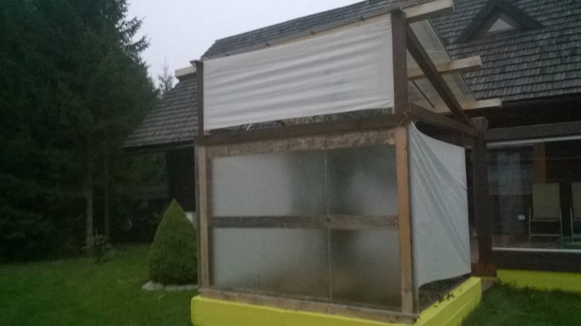 Daarom heb ik de schermen al uitgerold , al is het maar tegen die vervelende wind, moet ik wel zeggen dat ik overal bomen heb staan in de tuin van 8-10 meter en dat het hier haast niet waait,boom staat ook op het zuiden en het huis houdt oosten , westen en noorden wind redelijk goed tegen! dus misschien overbezorgd , maar dat kan geen kwaad naar mijn idee, ook alvast een bultje stro bij de stam ivm met de nachtvorstjes , bak is geissoleerd , maar zoals ik eerder zij kan geen kwaad. Er zit zelfs nog een heel heel klein beetje groei in ;)
