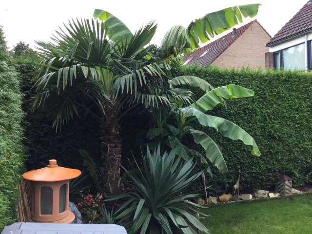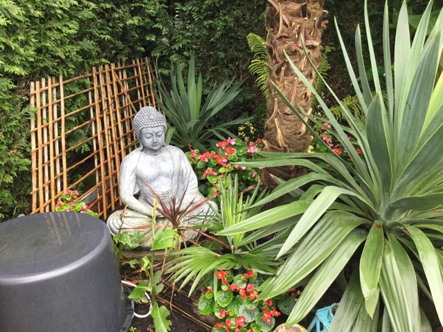Boeddha hoekje met op de voorgrond Trachycarpus Princeps. Helaas is een canna bij mij in de tuin geen succes i.v.m.veel hongerige slakken.