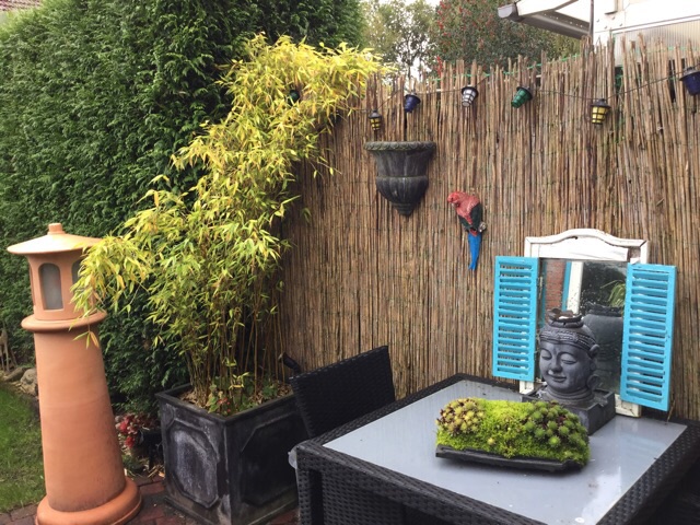 Fargesia Robusta Cambell. Zoals je misschien ziet aan de achterkant van het ligbed staan meerdere robusta's al een aantal jaren in de volle grond met als resultaat een hoogte van 4 meter. Ik heb deze kleintjes precies op dezelfde manier geplant. Ik zou inderdaad die beperkte ruimte niet aangedurfd hebben met woekerende (hogere) soorten.