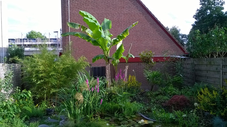 Ik dacht nu weer veel nieuwe ruimte te hebben voor andere planten. Maar de ruimte is eigenlijk alweer 4 keer ingevuld. Ik weet nog niet hoe ik dat ga oplossen. Ik heb een Gunnera tinctoria er neer gezet omdat ik die in mijn andere tuin heb verwijderd wegens de komst van de G. manicata. Op de plaats van de Ph. nigra heb ik nu Musa itinerans forma India geplant. Die had ik vorig jaar gezaaid. Verder heb ik nog een klein plantje van de Ph. nigra bewaard omdat ik er geen definitief afscheid van kon nemen. Mijn exotenhobby is namelijk met de nigra begonnen. En verder heb ik nu dus een stek van de Phyllostachys parvifolia en dat wordt ook een reus. Voorlopig staat ie in een speciekuip. Sowieso was ik dat al van plan voor quarantaine. Nu maar eens flink na denken over een toekomstbestendiger oplossing.