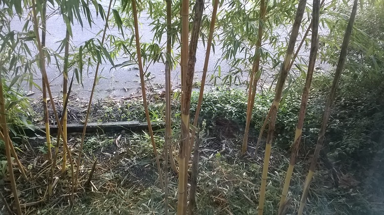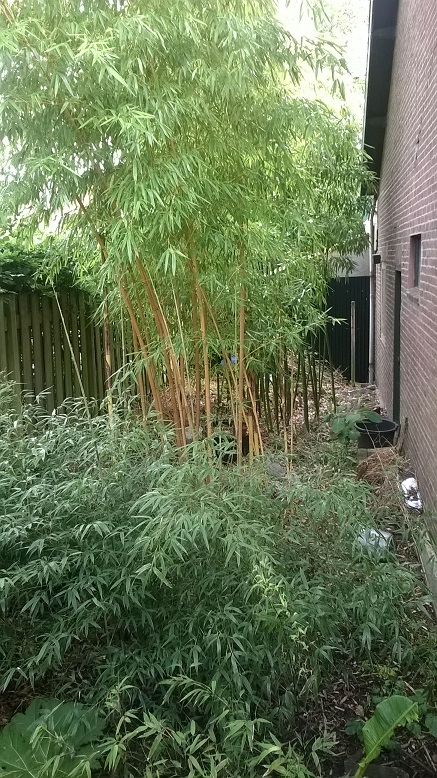 Het moet een overweldigende entree worden. Als je door de tuindeur binnen komt moet je rechts van je en boven je de manicata zien, daarna Phyllostachys aureosulcata aureocaulis (ook zo'n 5 a 7 meter hoog en over het pad hangend. En links dan een heuveltje op zijn plaats gehouden door een Ardenner Breuksteen muurtje en grote Musa's zodat je door een tunnel van groen loopt.