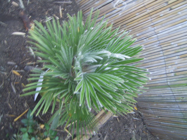 Vermoedelijk maakt het wat betreft winterbescherming weinig uit of je een gewone Chamaerops humilis hebt danwel een 'Vulcano' of 'Cerifera'. Ik heb een grote 'Vulcano' die geen probleem had met een 'droge' nachtvorst waarbij de minimum temperatuur tot -9°C daalde.