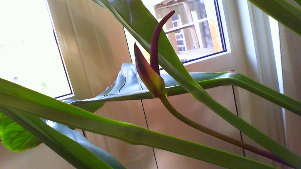 Anthurium hookeri misschien? Foto's hiervan tonen over het algemeen wel n iets grotere bloem maar dat kan zijn omdat deze binnen staat.