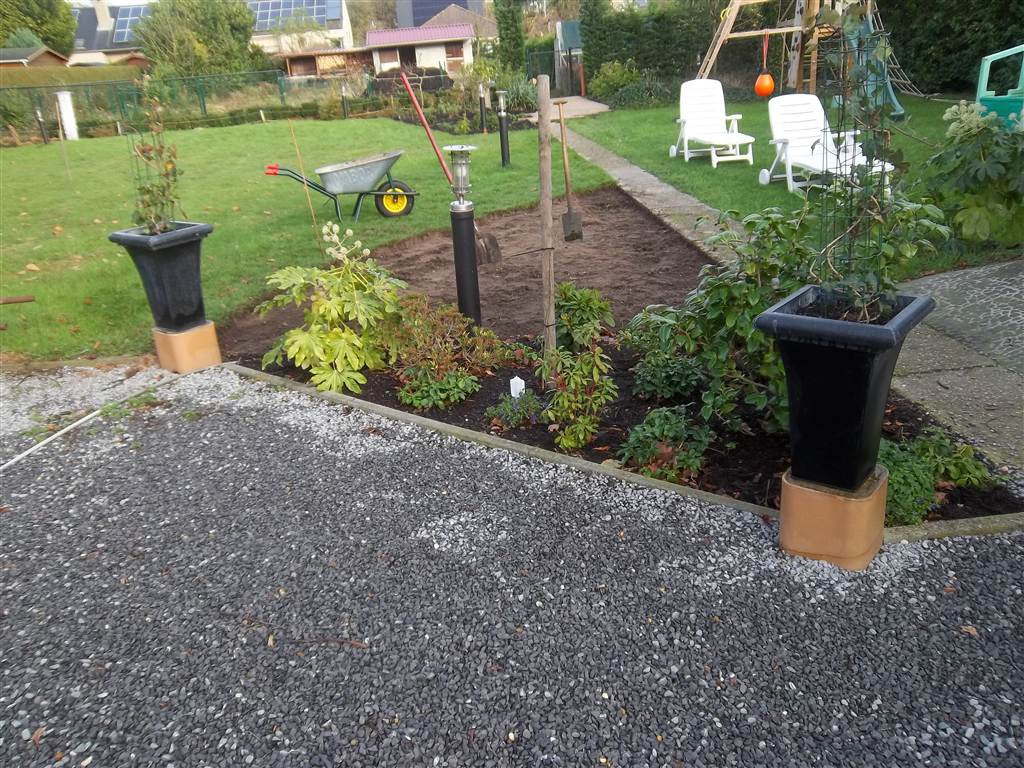 Ik ben momenteel bezig borders uit te steken waar in het voorjaar de winterharde exotische bomen en planten worden aangeplant. De meer gevoelige komen dan in pot op verharde perkjes in het gazon. Ruimte voor de speeltuin van de kleinkinderen moet ik wel behouden.