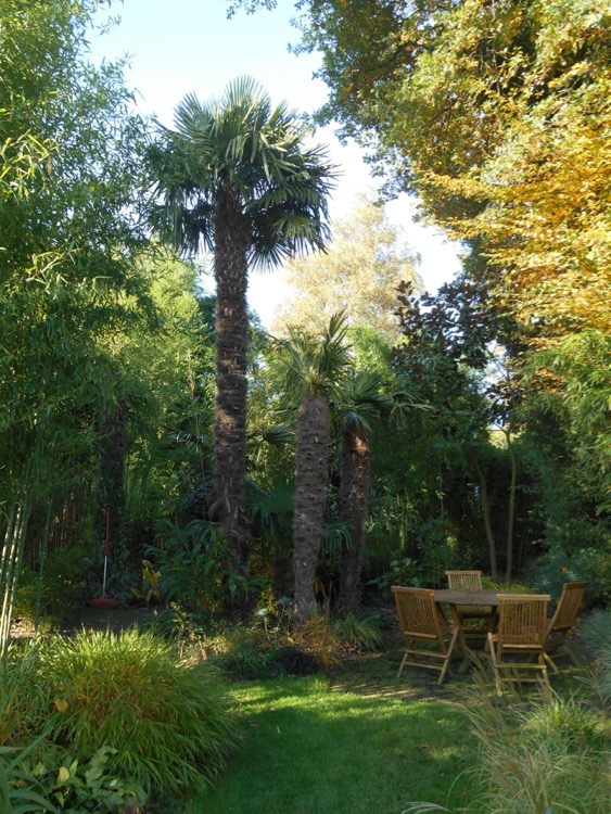 In de tuin waar ik de afgebeelde Trachycarpus fotografeerde staat overigens ook een van de oudste uitgeplante Rhapidophyllums in ons land. Vanwege de enorme bladeren vergeleken met mijn exemplaar in kuip herkende ik deze palm niet direct. De stekels op de stam waren echter onmiskenbaar. Helaas heb ik verzuimd een foto te nemen.