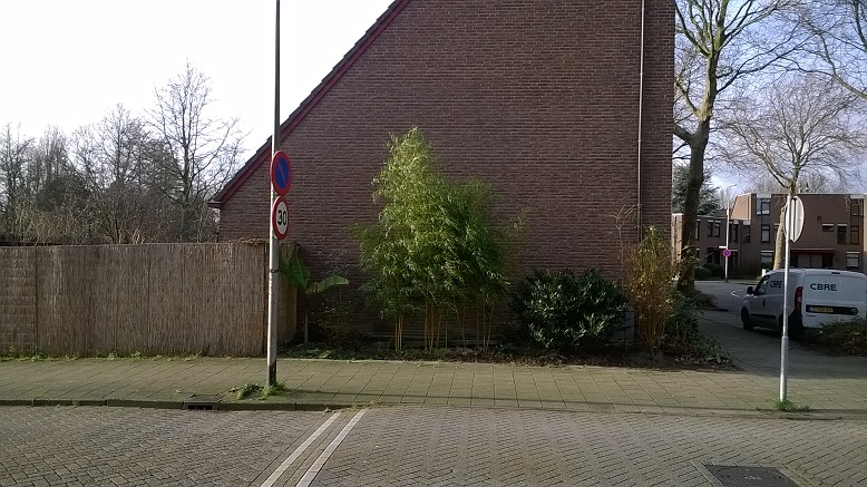Hierbij de update van de groei van Phyllostachys vivax aureocaulis in 2015. De eerste foto is van juni. De nieuwe scheuten groeien nog behoorlijk scheef. Om dit op te lossen heb ik een schroefhaak in de muur bevestigd en de scheuten met touwtjes rechter getrokken. Op de tweede foto staat alles mooi overeind. Deels door de touwtjes die er nog steeds aan zitten, deels doordat de wind er tegen blaast.
