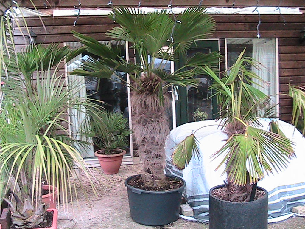 Wat een mooie dikke stam zeg die Wagnerianus op de 1e foto. Ik hoop en denk dat het allemaal nog mee gaat vallen deze winter. Ik heb ze in ieder geval allemaal weer uitgepakt en er alleen nog maar parasols erboven gezet i.v.m de vele buien op dit moment. De bananen staan allemaal nog wel ingepakt.