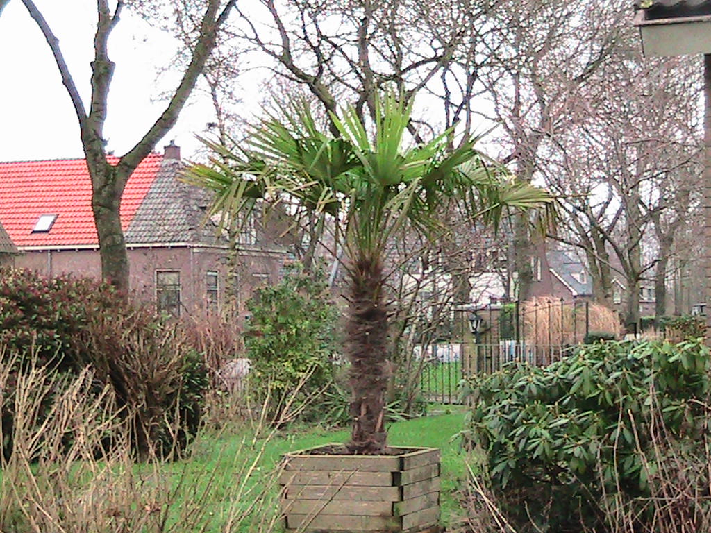 @Kraikonen: ik woon vlakbij het Fries congrescentrum. En jij? Ik heb wel een aantal middelgrote exemplaren in de tuin en een afdakje vind ik belangrijker dan inpakken. Kou kunnen ze erg goed verdragen en bij teveel inpakken breng je eerder schade aan is mijn idee. De Wagnerianus in de voortuin heb ik wel even ingepakt omdat deze zijn eerste winter ingaat en kwetsbaarder kan zijn. Verpakking ernaast daar zit een Basjoo in. Jammer dat je bij ons in Drachten zo weinig palmen en andere exoten ziet in de voortuinen he? Met verbazing kijk ik als ik in Brabant of Limburg ben in de voortuintjes hoeveel mensen dat daar wel hebben. Terwijl het bij ons over het algemeen de winters ook nog 'zachter' zijn (uitzondering nu dan)