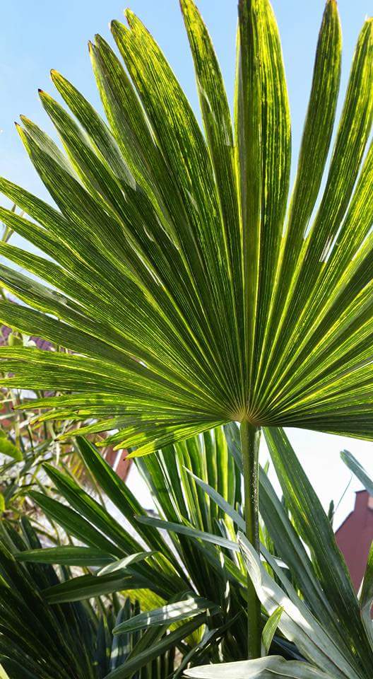 Mooie wagnerianus en prachtige brahea. Wat staat er onder het dak, een washingtonia?