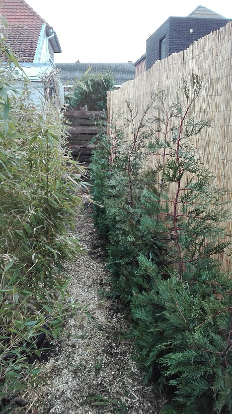 De eerste werken, voornamelijk om een geschikt microklimaat te maken, zijn gestart. Noordkant rieten matten en daarvoor komt nog een rij coniferen evenals het gebied rond mijn groot terras waar de composthoop nu gecamoufleerd is door een rieten mat. Daar komen dus ook nog coniferen staan. Ik laat deze groeien tot ongeveer 2.5m hoog zodat de wind minder spel heeft op mijn tuin Oja en sorry maar ik ben zo fier op het eerste legsel van mijn rijstvogels dat ik deze tropische vogel er ook even bij heb gezet ;-)