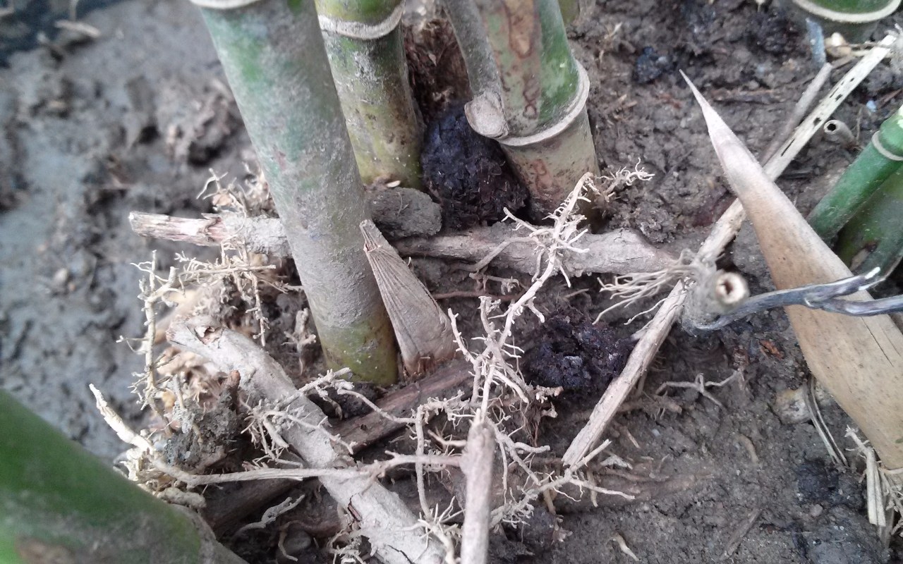 Sandro, die scheut is wel erg vroeg in het seizoen. Ik vermoed gelet op de strokleur dat het een verdroogde restant is van vorig (na)jaar. Waarschijnlijk kun je die zo lostrekken (voorzichtig). Nieuwe scheuten zijn overigens ook aanvankelijk fragiel en hier althans in trek bij slakken. Ze verschijnen bij Phyllostachys doorgaans vanaf eind april en groeien dan snel. Je grond ziet er tamelijk verarmd uit, misschien kun je er een laag compost opbrengen en licht inwerken.