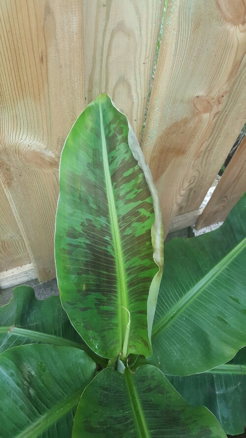 Ik lees al een tijdje mee op dit forum en ben hierdoor aardig interesseerde geraakt in musa's. Ik heb besloten om toch maar een account aan te maken, omdat ik met een vraag zit. Ik heb zelf 3 kleine basjoo's en een wat grotere Dwarf Cavendish en er viel mij iets op aan het laatste blad van mijn Cavendish (zie foto). Heeft iemand enig idee wat dit is. Het verscheen in de laatste fase van het ontrollen. Toen was de rand van het blad al heel zacht en het ziet er nu uit als op de foto.