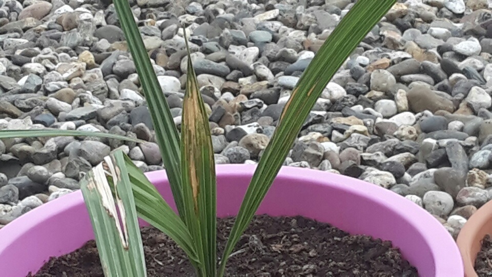 Hier een foto van één van de zaailingen, je ziet dat er direct weer nieuwe bruine vlekken ontstaan op het blad dat er net uit is gekomen, ook zie je dat het blad helemaal links(boven) helemaal licht bruin en dor is: