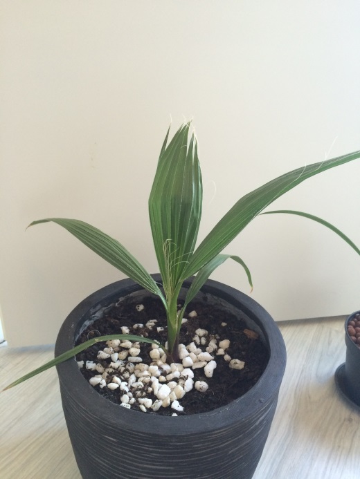 Allemaal hebben ze bladeren van nu ongeveer 40cm lang. Maar terwijl 5 palmen met hun 3e blad bezig zijn is die ene met zijn 6e bezig en zijn de bladeren aan het splitsen (of hoe dat ook alweer heette