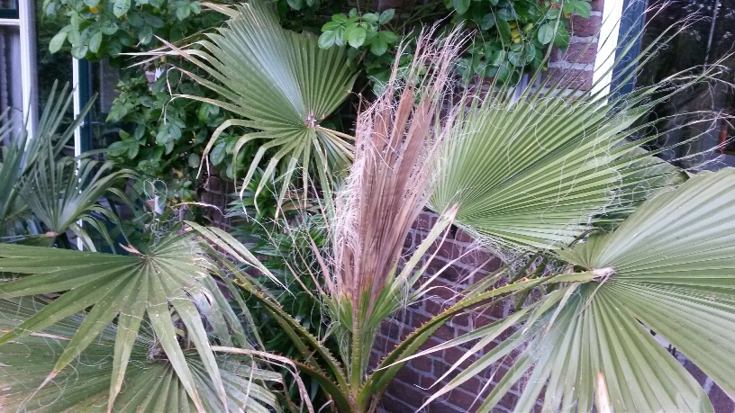 De afgelopen twee weken met het warme droge weer, ging de Washingtonia in de volle grond hier weer goed aan de groei. Echter aan het eind van de droge periode zag ik ineens dat het nieuwste blad dat hij al in maart gemaakt had, slap hing. Het leek op uitdroging. Ik heb hem toen maar snel water gegeven. Nu na een paar dagen zie ik echter dat het blad niet meer bijtrekt. De palm staat nu 3 jaar in de volle grond en heeft verder nog niet eerder problemen gehad. Op de foto is het verdroogde blad het blad dat naar rechts hangt, het is al volgroeid. Het is lastig te zien op de foto, maar zoals je ziet is het iets lichter van kleur en zijn de bladpunten dichtgevouwen. Niet te verwarren met het lelijke blad dat er nu uitkomt, dat blad is nog bruin van vorstschade van deze winter. ik dacht dat deze palm na 3 jaar wel diep genoeg wortels zou hebben gemaakt. Hij staat wel tegen de warme droge zuidmuur, maar dit is toch nog niks in vergelijking met de droogte die ze in hun originele habitat hebben. Of heeft dit een andere oorzaak?