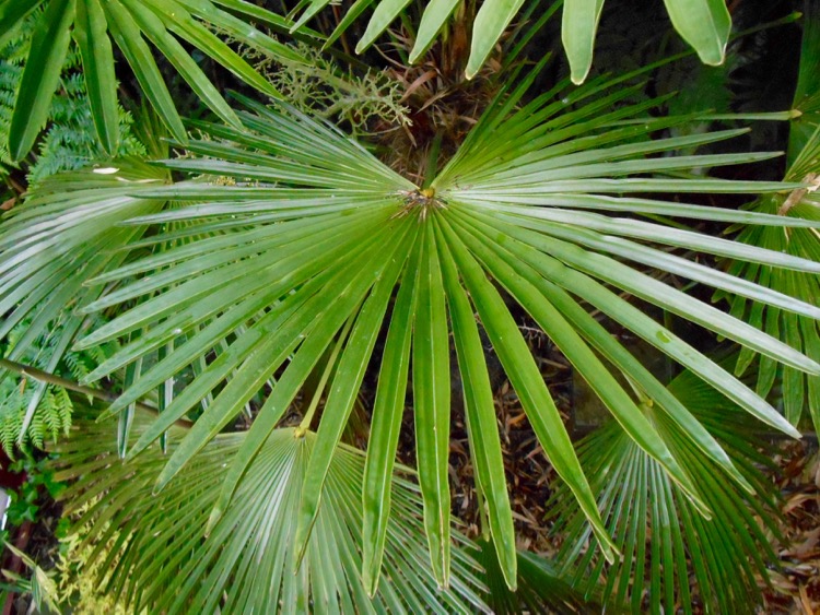 Met wat speurwerk en een dosis geluk kun je bij het reguliere aanbod palmen aantreffen met cirkelronde bladeren. Bij Trachycarpus fortunei is dit verschijnsel niet heel zeldzaam en heb ik deze vorm een drietal keren kunnen bemachtigen. Ook bij Chamaerops tref je deze cirkelronde bladeren soms aan. Daarentegen ben ik deze cirkelvorm bij een wagnerianus nog niet tegengekomen. Iemand anders wellicht? Bij het fortunei blad is de cirkel geheel rond en is zelfs sprake van een overlapping. De 48 segmenten bepalen een doorsnede van 120 cm. Bij een wagnerianus met ± 40 segmenten is de diameter omstreeks de helft.