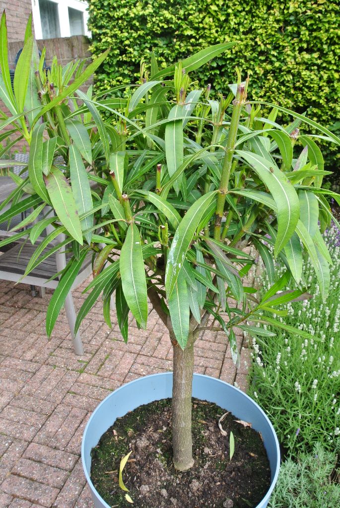 Toch wel best raar dat ze overal juist zeggen dat een oleander veel water en voiding nodig heeft. Kom net terug uit het kurkdroge Sardinie en daar staan ze ook overal op zeer droge plaatsen vol in bloei ... Mijn oleanders zijn inmiddels weer flink gergroeid maar onderaan worden de bladeren vrij snel geel met zwarte vlekken en vallen dan af... Boven waar het zonlicht goed de plant raakt zijn de bladeren wel mooi stevig en groen... Het blijft met ons natte en zonloze klimaat toch een vrij moeilijke plant ...