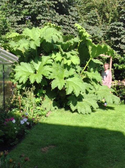 Die gunnera ziet er mooi uit! Hier weer een update nu het groeiseizoen van de Gunnera er bijna op zit. Met het natte weer is deze Gunnera flink aan de groei gegaan. Helaas hebben we hier dit jaar een slakkenplaag, ze eten wel aan de Gunnera, maar dat valt gelukkig nauwelijks op met die grote bladeren. De laatste twee bladeren steken er nu boven uit, ze moeten nog ontvouwen en in grootte groeien. De stengel van het langste blad is nu 220 cm en 270 cm vanaf de grond. Het blad van deze stengel moet nog uitgroeien, ben benieuwd wat de totale hoogte gaat worden. Het tot nu toe grootste blad is ruim 200 cm in diameter. Hij is toch nog iets groter geworden dan afgelopen jaar, zeker met die laatste bladeren. Ik zal over een paar weken weer wat foto's plaatsen als de laatste bladeren volgroeid zijn.