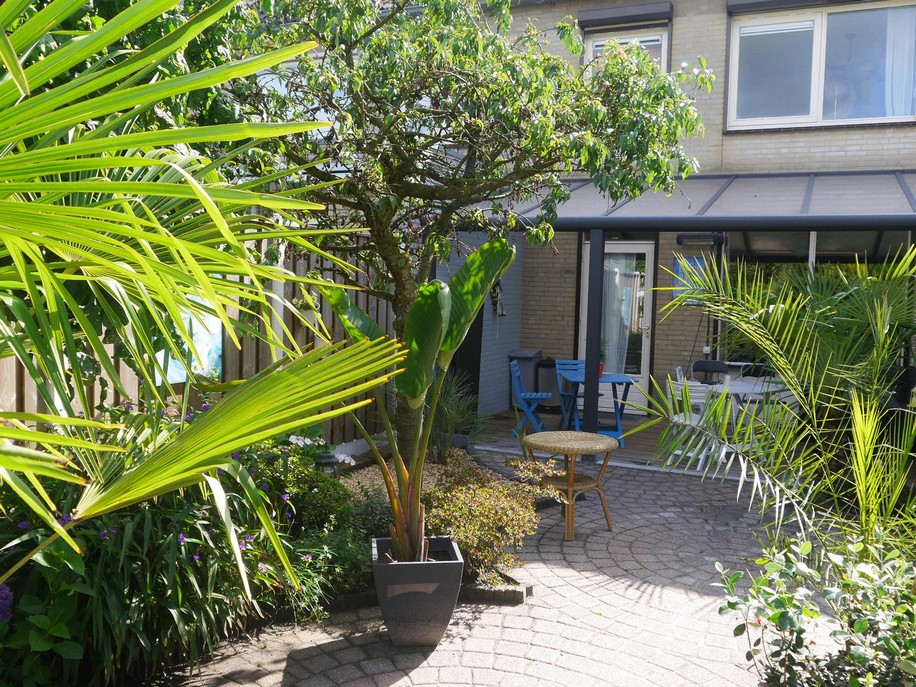 Dit jaar heb ik de stenen verwijderd en planten in het midden van de tuin geplaatst. Er komen grindpaadjes omheen met stapstenen. Ook heb ik wat nieuwe klimmers en bamboes gekocht, zodat alles mooi dicht kan groeien. De potplanten zijn verhuisd naar de serre en naar het plateau bij het water.