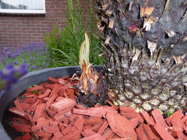 De Cycas hier heeft zowat de hele winter buiten gestaan en staat vol in de zon ( dat is hier met deze zomer zo ongeveer een half uur per week 8-) )