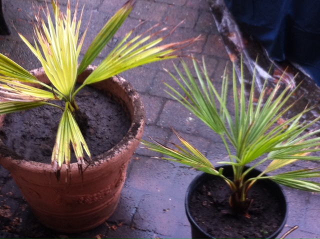 Heeft er iemand tips om deze 2 palmen terug mooi te krijgen.