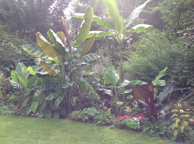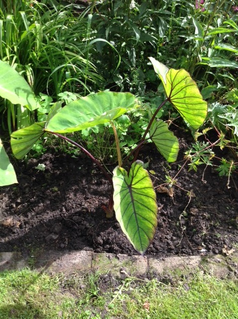 - Zijaanzicht tuintje. Colocasia Jack's Gaint.