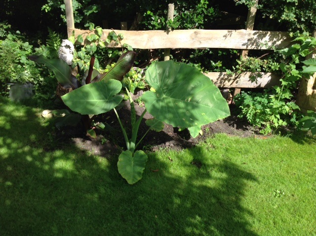 - Zijaanzicht tuintje. Colocasia Jack's Gaint.