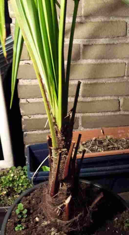 Het lijkt wel alsof het een soort pigment is ofzo. Wat voor vlekken had jij dan? Misschien is t wel 'normaal'. Ik vind het blad extreem gevoelig voor wind met als gevolg dat zelfs op een beschutte plek ze een beetje rommelig er uit zien. Aan de andere kant ben ik verliefd op de kale haarloze stam. Hij is ook vrij dik. Ik vind het veel meer een subtropisch idee hebben. Fortunei's, vooral de slappere cultivars, vind ik extreem lelijk en ieltjes. Bij Fortunei's koop ik daarom of sterke cultivars met blauwe bladeren of de Nainital die ook veel robuster uiterlijk heeft. Vooral bij de Wagnerianus vind ik al dat haar vreselijk lelijk staan al zijn de stijve bladeren zo mooi. Gardenpalms meent dat de Kumaon in volwassen staat toch winterharder dan (de slappere cultivars van de) Fortunei. Om die reden heb ik hem toch aangeschaft. Alleen dat blad is jammer. Ik verwacht echt dat de echte Kalamuni Takil de perfecte palm zal zijn. Stijvere bladeren en een kale stam die ik persoonlijk mooier vind. Alleen groeit die zo traaaaag...... Om die reden dat ik toch een licht zwak voor de Kumaon heb. Al irriteert het blad me extreem. Ik heb me daar toch maar overheen gezet vanuit het idee dat hij als hij groot is toch wel erg mooi er uit kan zien.