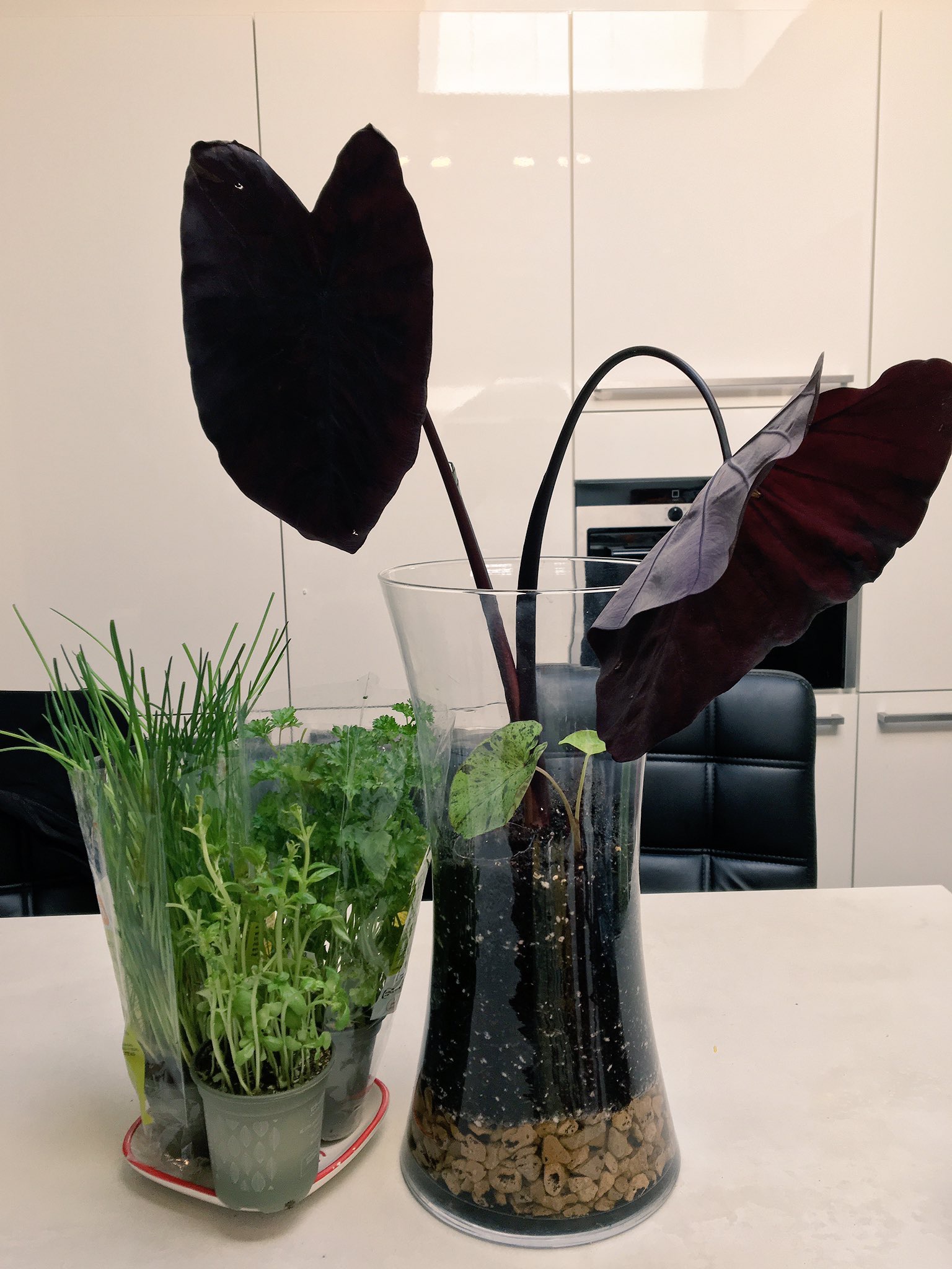 Voorlopig staat die daar enkel voor de luchtvochtigheid, mijn andere colocasia's gaan in een raam op het zuiden staan, maar dan zal ik moeten water vernevelen of ze zullen opdrogen.