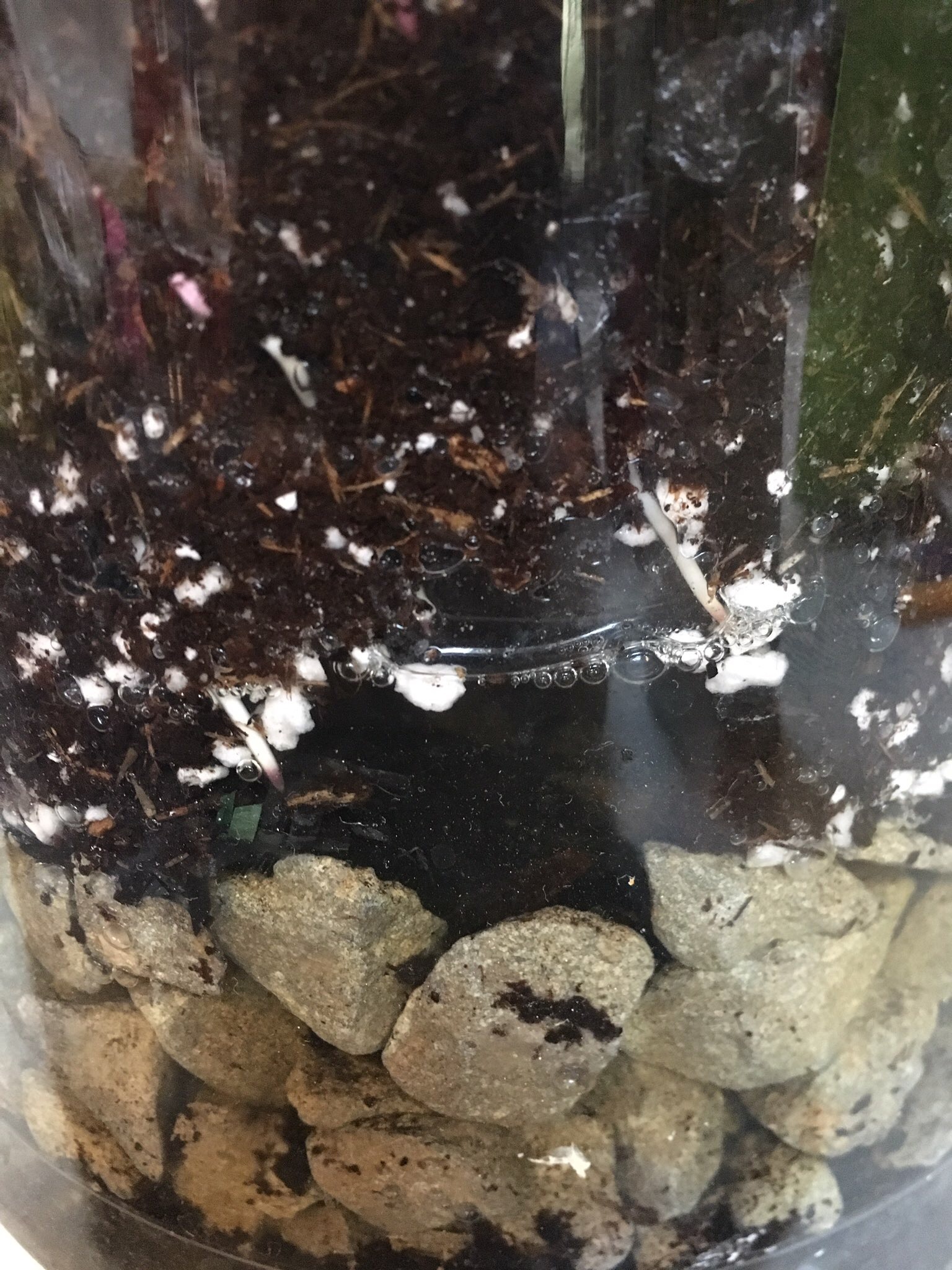 Vaas gevuld met 15 cm. grind, daarin een klein flesje met afgesneden bodem en opgevuld rond de fles en in pot een mengsel van potgrond en perliet.