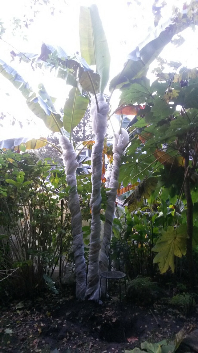 Het afdak heb ik afgemaakt met plastic om zoveel mogelijk van de kou buiten te houden en bovendien de wind tegen te houden. De bananen in de volle grond heb ik voor deze week nog maar even goed ingewikkeld.
