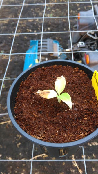 Ik heb er na al die pogingen ook eentje geprobeerd direct in de grond te laten ontkiemen, deze was al gespleten toen hij boven in de kou stond, maar begint nu een klein steeltje te laten zien: